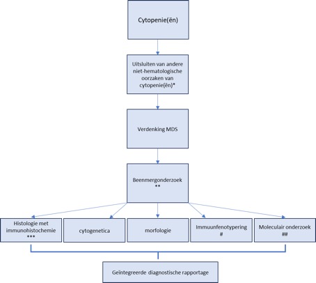 Om de diagnose MDS te stellen is aanwezigheid van een cytopenie zonder andere verklaring noodzakelijk met afwijkingen in het bloed en beenmergonderzoek die bij MDS passen zoals geformuleerd in de WHO classificatie 2022 en ICC classificatie.